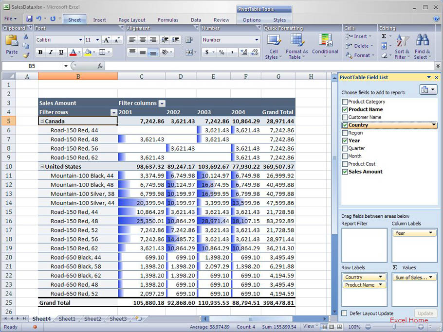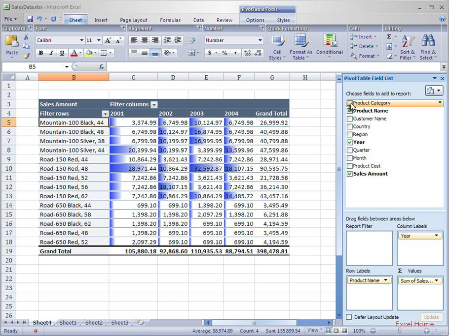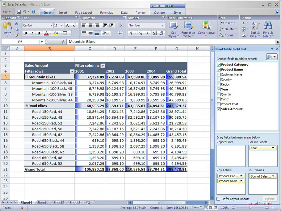 You’ll notice that there is no conditional formatting of the sales values for the “Product Category” field (“Mountain Bikes” and “Road Bikes”). It wouldn’t make much sense since those values are not at the same level as the values for the individual products.