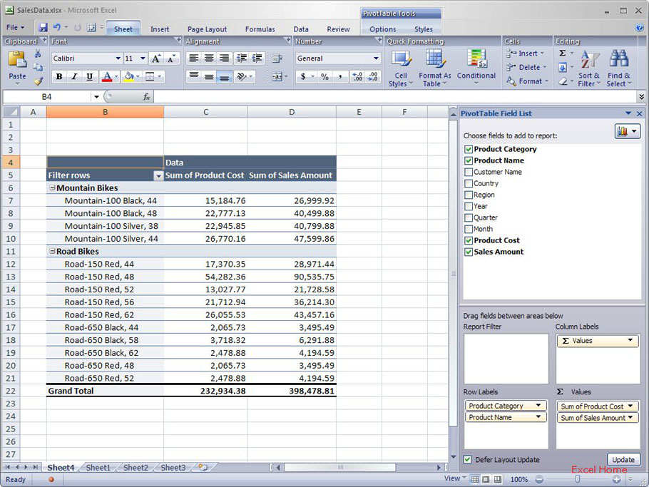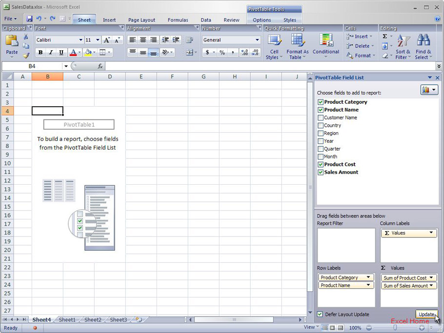 Here’s an example. I created a new PivotTable, checked the Defer Layout Update check box, and then added four fields. At this point, my PivotTable is still empty. Now, I’ll press the “Update” button to apply the changes.
