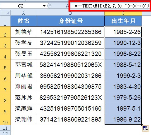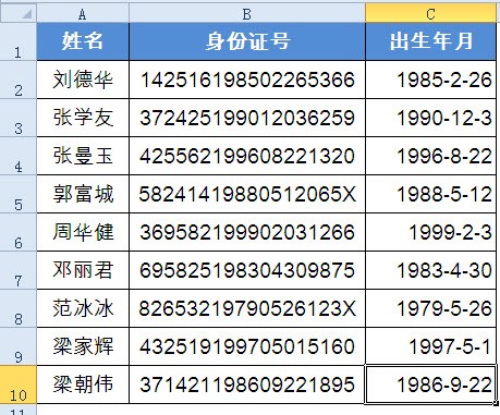 在整理员工或者学生档案信息时,输入身份证号码后,往往还需要从身份证中提取身份证所属者的出生日期。今天,我们就用下面一组模拟的数据,一起学习一下从身份证中提取出生日期的方法。