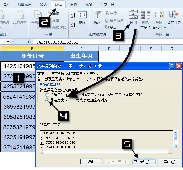 选择B列数据区域,单击【数据】【分列】,在弹出【文本分列向导 第1步,共3步】对话框中,选择“固定宽度”,单击下一步。