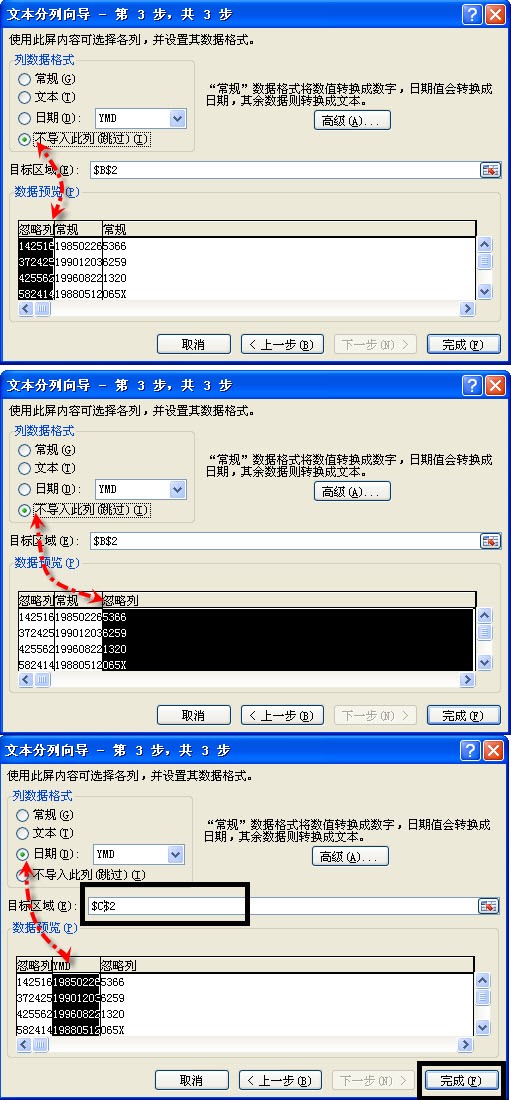在【文本分列向导 第3步,共3步】对话框中,依次点击最左侧列,点选【不导入此列(跳过)】。