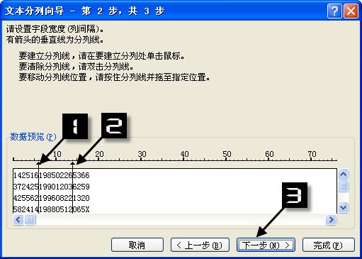 在【文本分列向导 第2步,共3步】对话框数据预览窗口中,单击第6位和第7位之间的刻度,再单击第14位和第15位之间的刻度(也就是留出出生日期的宽度),单击【下一步】。