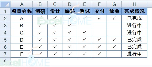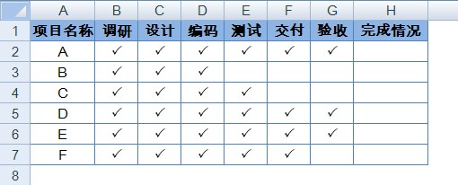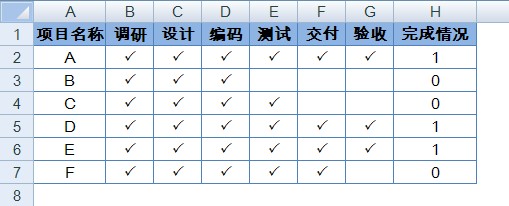 工作中有一些项目进程跟踪表格通常如下图所示,在“完成情况”一列中会通过文字来标识项目完成情况。