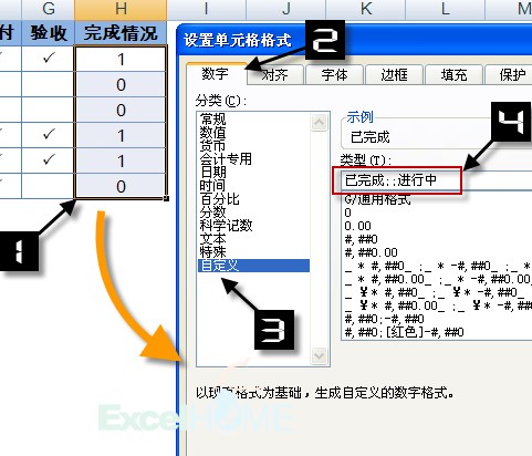 为了增强表格可读性,H列的显示内容还是可以设置为中文字符“已完成”或“进行中”,并同时保持单元格数值仍旧为1或0,其方法就是通过自定义数字格式来实现。