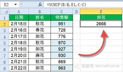 =SUMIF(B:B,”如花”,C:C)