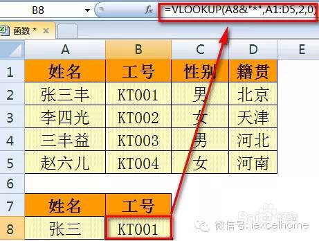 =VLOOKUP(A8&”*”,A1:D5,2,0)