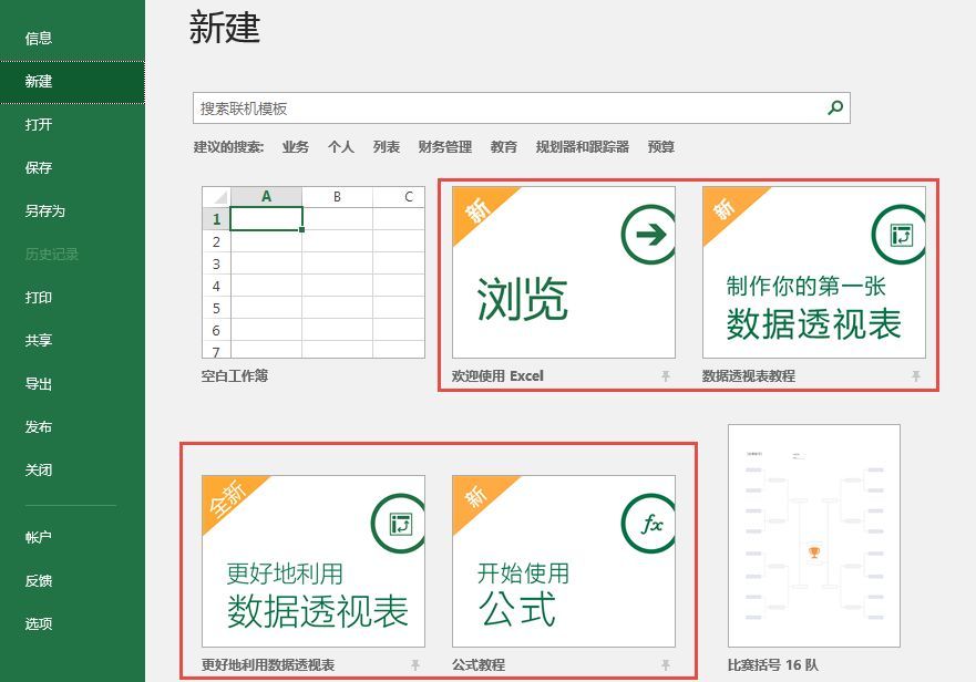 打开Excel 2016,点击【文件】→【新建】,在模板列表中,微软新增了四个模板,分别是“欢迎使用Excel”、“数据透视表教程”、“更好地利用数据透视表”和“公式教程”。